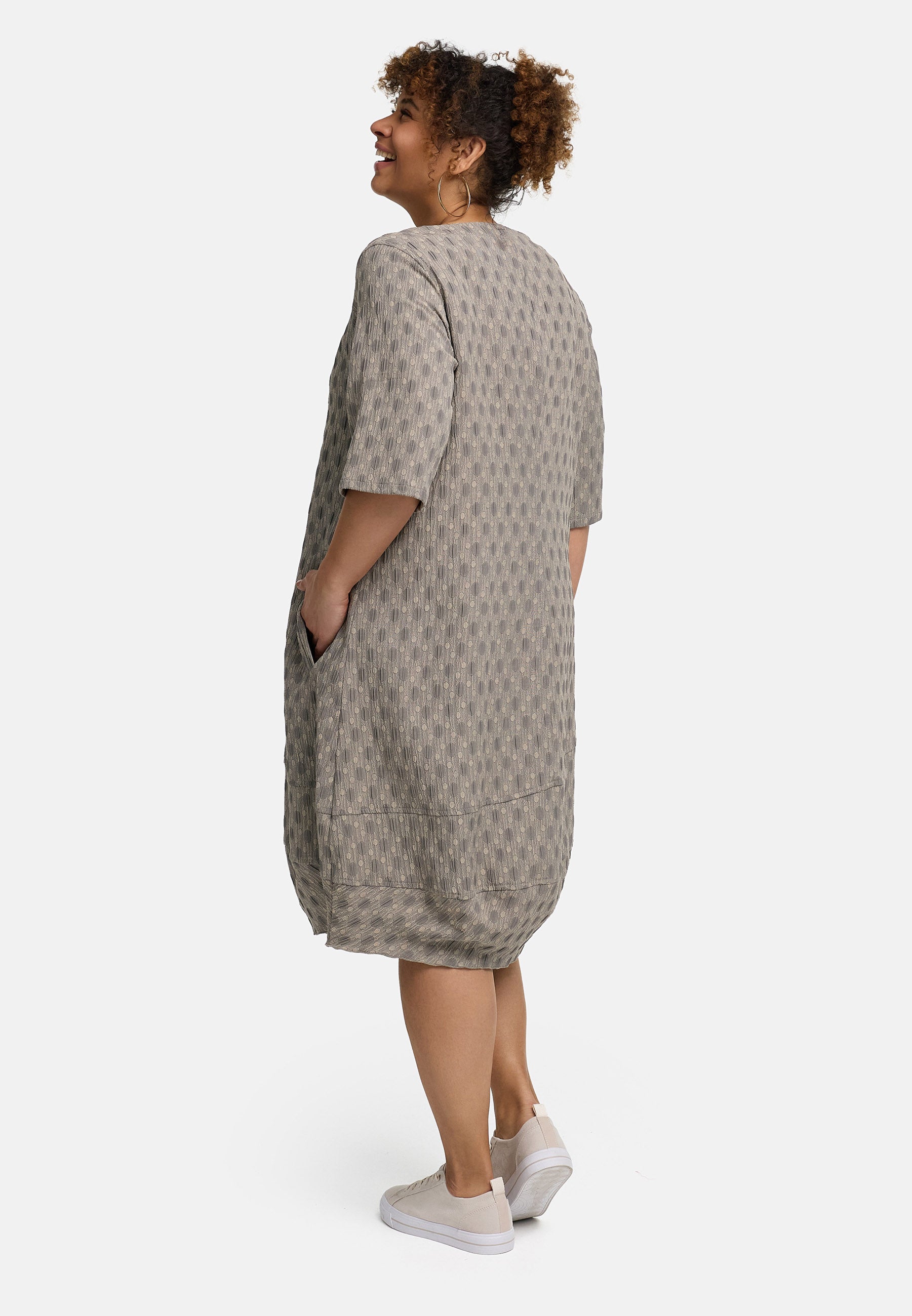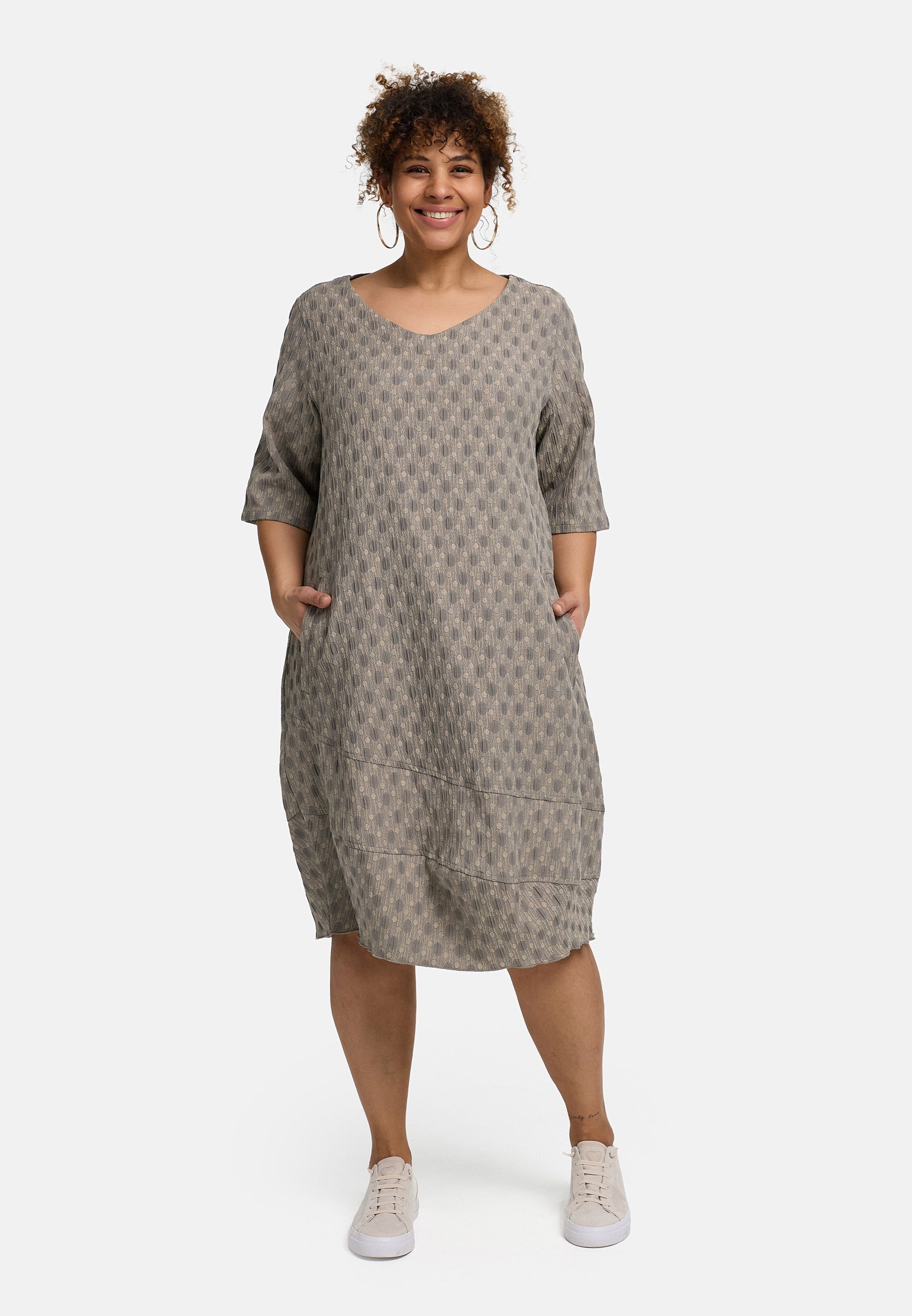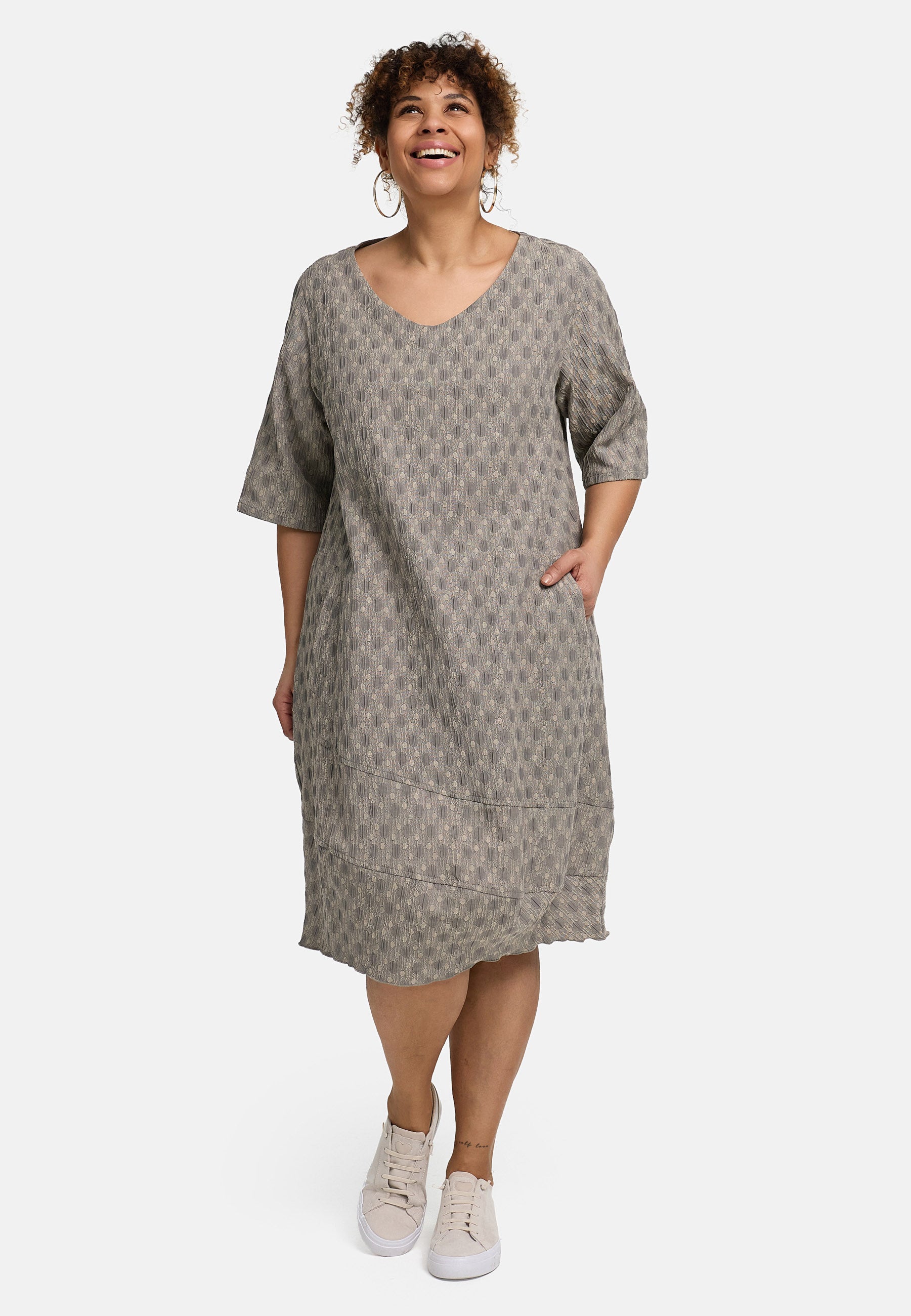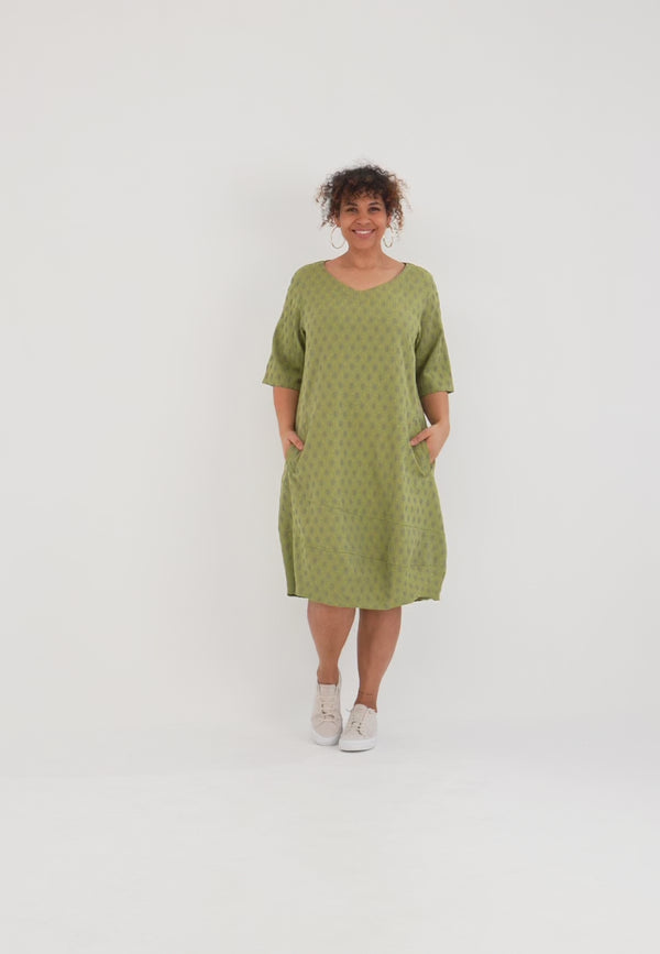 • Pasvorm: Los-ontspannen, knie-omvattend, recht tot zachte Cocoon/O-vorm • Details: zachte V-hals, halve mouw (ellebooglengte), zijzakken, brede zoompartij met decoratieve deelnaden, instapvorm zonder sluiting • Kleur/Design: Ton-sur-ton jacquard met fijne ovalen – Salie/Matcha-groen of Steengrijs/Greige